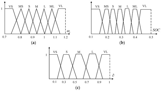 Figure 7. The membership functions used in FLC. (a) The membership function of . (b) The membership function of (c) The membership function of . - (3)