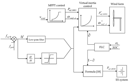 Both DFIG and ES have to be taken into account to determine the output power proportion . For DFIG, if its output power proportion is too large, it may face the risk of torsional vibration in the shaft system caused by too much rotor speed regulation [28], the risk of an unstable power grid caused by a rotor speed recovery range that is too large, and the risk of DFIG disconnection due to rotor speed declining below the threshold [29]. For ES, if its output power proportion is too large, it may face the risk of service life reduction as the result of frequent deep charging or discharging, which will cause excess maintenance cost. Therefore, the determination of output power proportion is a complicated problem where the appropriate mathematical expressions are difficult to establish.
