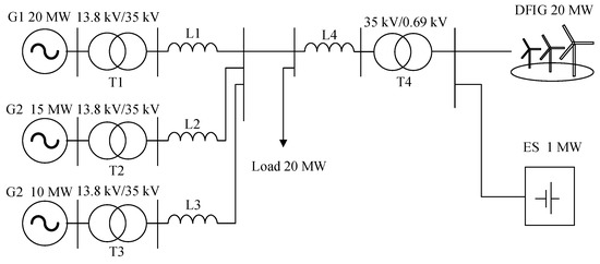 In order to verify the effectiveness of the proposed control strategy and the rationality of the designed fuzzy logic controller and proposed capacity allocation scheme of the ES system, a simulation system, whose structure is shown in Figure 9, was built on MATLAB/Simulink software. Because the proposed control strategy referring to single DFIG and single ES is universal, an equivalent DFIG was selected to represent the wind farm. The simulation system consisted of an ES system following the capacity allocation scheme, as well as three synchronous generators representing three power plants, transformers, loads, and equivalent lines. The battery ES model used in this paper was from MATLAB/Simulink original library, and this model was an integration of serial and parallel combinations of multiple single cells. The detailed parameters of each component in the simulation system were obtained from [12,33] and are shown in Table 2.