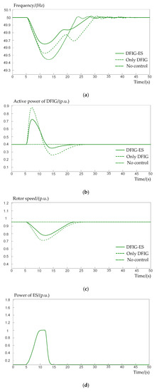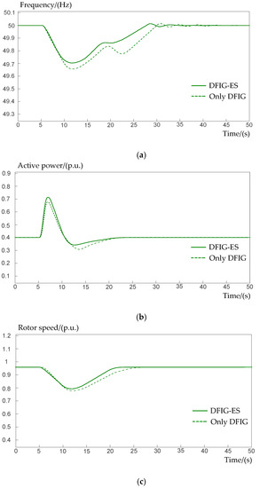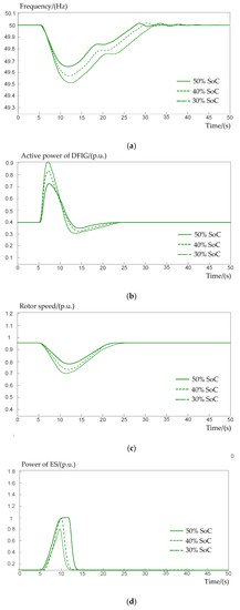 When the wind speed was 9 m/s, the initial of ES was set as 30%, 40%, and 50%, respectively. The frequency curves are shown in Figure 12a. The output active power curves of DFIG, and the rotor speed curves and output active power curves of ES are respectively shown in Figure 12b–d.