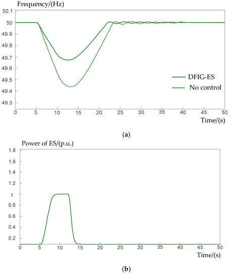 Under the conventional inertia control method, the output active power of DFIG reached the maximum power in this scenario, and thus the frequency response effect under inertia control was the same as that under no inertia control. Therefore, in this part, the coordinated control method and no control method were taken as comparison. The wind speed was set as 13 m/s and the initial of ES was set as 50%. The frequency curves are shown in Figure 11. Figure 11a shows the system frequency curve. The output active power of the ES is shown in Figure 11b.