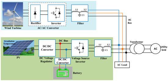 Dynamic and transient analyses are important concepts in power systems. The infrastructure of the main electric grid evolves with the integration of hybrid energy systems that form renewable energy systems. The hybrid microgrid is a grid structure comprising both grid and renewable energy sources, or renewable energy sources only. As shown in Figure 3, hybrid microgrids can comprise more than one energy source in the same distribution grid [29,30]. In renewable energy sources or hybrid energy systems, this situation can be prevented using control algorithms that run independently of system parameters, such as the sliding mode control method, whereas unknown system parameters or changes in system control algorithm parameters that depend on model parameters, such as the model predictive control method, adversely affect control efficiency [31,32].