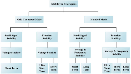 The stability conditions in microgrids used in the literature are presented in Figure 4 [33,34,35,36,37]. Stability methods have been applied in both grid-connected mode and islanded mode. These methods are used to provide small signal, voltage and frequency stability. The stability is implemented in the short term, ultra-short term and long term.