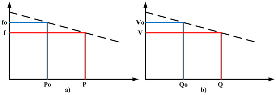 Microgrids are connected to the system with a power electronic converter and inverter (DC-DC, DC-AC, etc.). Since energy flows occur between parallel energy sources, the energy flows are controlled [46]. This control is generally carried out using the droop control method, a method that is used for sharing power between synchronous generators [50]. The most important characteristic of this method is that it allows power sharing between sources, and does not require communication infrastructure [51]. The relationship between active power-frequency and reactive power-voltage used for droop control is shown in Figure 6. Inverters are connected to the system in parallel according to the used method [52]. This control method is also used for sharing power between uninterrupted power sources (UPS) connected in parallel without a control cable.