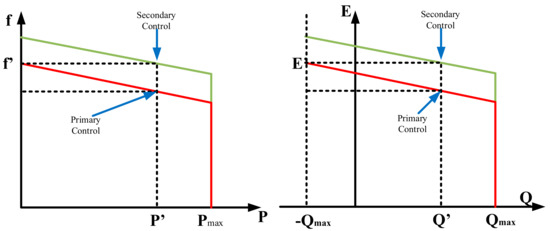 The second control layer is referred to as the secondary control and is designed to minimize frequency and voltage fluctuations of the system. Due to load and process values of generators in the system, which may vary continuously, voltage and frequency values vary as well [69]. To prevent this fluctuation, the secondary control method is used. Frequency and voltage values of the system are compared to the reference values [70]. The fault statement is sent to all units to prevent disruption of the system balance, and is generally used to maintain the grid frequency fluctuation limit at ±0.2Hz [71]. Characteristics of primary and secondary control methods are presented in Figure 7.