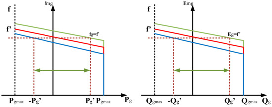 The frequency value of the main grid is constant. Therefore, power exchanges between the main grid and microgrid depend on the droop characteristic of the microgrid [72,73]. Power exchanges are controlled by changing reference frequency and voltage values of the microgrid [74]. The characteristics of the tertiary control method are shown in Figure 8. As seen in Figure 8, fmg is the frequency at maximum generated power, Emg is the voltage at maximum generated power, Pgmax is the maximum generated power, Qgmax is the maximum reactive power, fg is the frequency generated and Eg is the voltage generated for the tertiary control method. In addition, the tertiary control method shows the relation between f (frequency) and Pgmax (maximum generated active power), as well as between f (frequency) and Qgmax (maximum generated reactive power). These control methods are frequently used in the literature to control different types of microgrids [75], especially AC microgrids, although they have recently started to be applied to DC microgrids [76]. A number of grid elements, such as solar energy systems, storage elements and electric vehicle charging stations, are features of a DC microgrid [77].