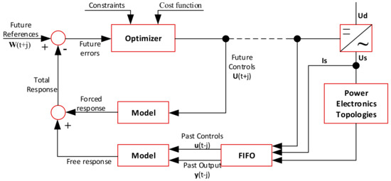 The total response of system behavior is determined as the sum of free and forced responses for the entire future system’s behavior in linear systems. The sum process is calculated using the superposition principle. This sum is pre-calculated up to a prediction horizon, which is determined by a set of future reference values output by the system. The difference in future control error between the future reference and pre-calculated actual values is then obtained. This method takes system restrictions and the cost function into account, and a set of optimum future values u (t+j) from the expected error are determined by this method [88,89].