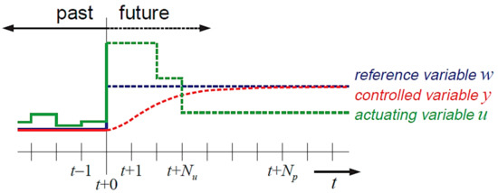 The MPC leads to a high calculation density because of the pre-calculation of the system’s behavior. The calculation density is significantly reduced at a control horizon. When the horizon is reached in a steady state, the controller output remains constant. This situation is shown Figure 13.
