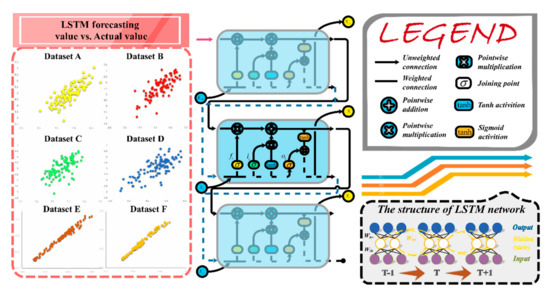 - In the LSTM module, the first step is to determine which information will be discarded from the cell state. The forget gate () is in charge of making decisions, as follows:where σ is the sigmoid function which turns the input value into an outcome between 0 and 1. T signifies weight parameters, and b denotes bias parameters (i.e., , , , and and ,, , and ). In this part, the exponents of T and V are not power values; they are just notations used to illustrate which gate the parameters belong to. For instance, represents the weight parameters belonging to the forget gate, namely gate f.
