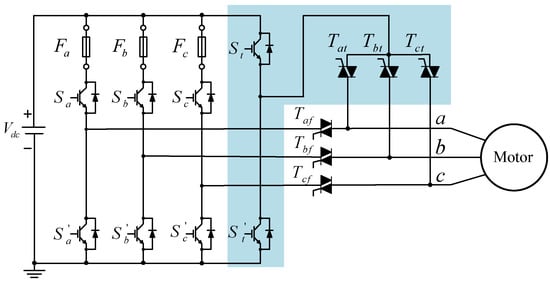 This research covers the situation when one power switch of the inverter is open- or short-circuited. The fault-tolerant inverter drive system is shown in Figure 1, which contains six IGBTs, , , , , , and , and two back-up IGBTs, and . At the output of the inverter, six TRIACs, including , , , , , and are added. In addition, three high-speed fuses , , and are inserted into the inverter and a back-up leg, including and , is added as well. This paper discusses an open-circuit fault and a short-circuit fault of one leg in the inverter.