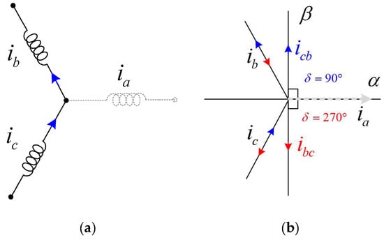 where is the performance index in a faulty condition. and are the current deviations in the d-axis and q-axis in a faulty condition. The DSP diagnoses the faulty condition by measuring the deviations of the d-axis and q-axis currents and then identifying whether the faulty condition occurred in either the a-phase, b-phase, or c-phase. The DSP transforms the a, b, c axis currents in the – axis currents, and then computes the current angle [,]. Taking the a-phase fault as an example, Figure 2a shows the b-phase and c-phase currents when the a-phase winding is open-circuited. The current can flow in either direction as shown in Figure 2b. The current may flow from the b-phase to the c-phase, which results in the current vector having a 270 angle, or the current may flow from the c-phase to the b-phase, which results in a 90 angle. The summarized results of the current angle when one phase is faulty are shown in Table 1. By computing the current angle , one can easily diagnose which phase is open. After that, an isolation and control method is executed to isolate the faulty part, and uses the back-up leg to replace the faulty leg. A fault-tolerant SPMSM drive system, thus, can be achieved.