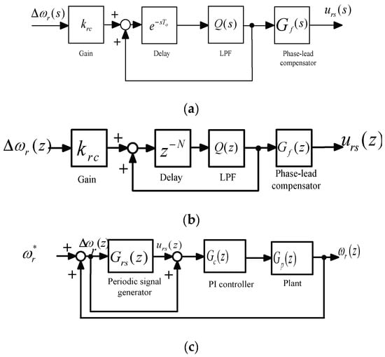Periodic controller in speed-loop: (a) s-domain periodic controller ; (b) z-domain periodic controller ; (c) closed-loop control system.