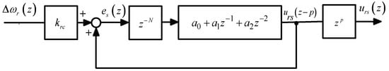 The components of the periodic controller are shown in Figure 6. The speed error is multiplied with a control gain , and then added to the to generate . A low-pass filter, , is used to reduce the high-frequency noise. After that, the output of the low-pass filter, which is , is added to the to obtain Finally, passes through the phase-lead compensator to obtain the . By using k as the interval step number, the output before delay is expressed as , and then the system error can be transformed into