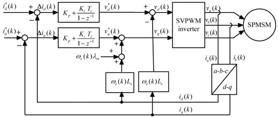 In the d-, q-axis synchronous frame, the dynamic equation of currents for an SPMSM is expressed as