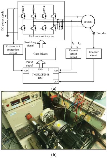A block diagram of the implemented SPMSM drive system is shown in Figure 9a. A DSP type TMS320F2808 was used as the control center. The SPMSM drive system includes a fault-tolerant inverter, a DSP, gate drivers, current-sensing circuits, an encoder circuit, and an overcurrent protection circuit. The speed-loop PI controller includes and , which are obtained by pole assignment with two poles, and . The speed-loop periodic controller includes , , N = 50, and . The sampling interval of the speed loop is 1 ms. The current-loop PI controllers include and = 0.0006, which determine the inner-loop current dynamics. The sampling interval of the current loop is 100