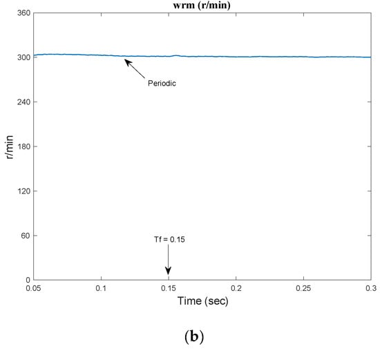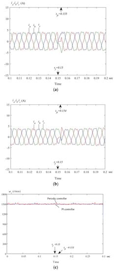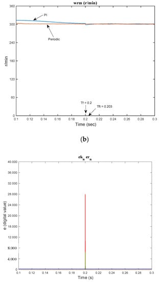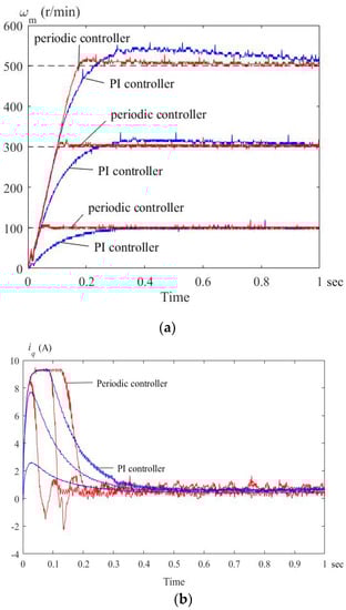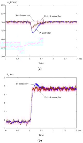 Figure 10a shows the measured speed responses at 100 r/min, 300 r/min, and 500 r/min. The periodic controller has quicker transient responses than the PI controller. Figure 10b shows the measured q-axis currents. The periodic controller provides greater input power when compared to the PI controller. Figure 11a shows the speed responses at 500 r/min when an external load of 3.5 N∙m was added. The periodic controller provides a lower speed drop and quicker recovery time than the PI controller. Figure 11b shows the q-axis current responses in the same case. The periodic controller shows better performance than the PI controller, including a lower overshoot and quicker recovery time when an external load is added.
