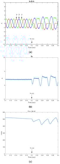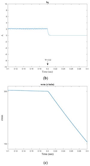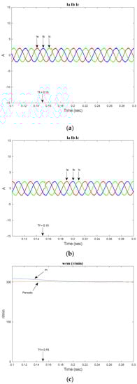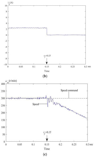 Figure 12a–c show the simulated results of the a-phase open circuit at 300 r/min without using the fault-tolerant method. The simulated results include the three-phase currents, q-axis current, and speed. Figure 13a shows the measured three-phase currents without using the proposed fault-tolerant method of the SPMSM drive system when its a-phase upper leg was open-circuited at 300 r/min. The faulty condition occurs at 0.15 s. A manual switch was in series with the power device. When the switch was opened, the power device was instantaneously opened. Thus, the PMSM drive system became a three-phase unbalanced drive system. Figure 13b shows the q-axis current response when the a-phase upper leg is open. The q-axis current oscillated due to the unbalanced three-phase currents. Figure 13c shows the measured speed response. As we can observe, in this figure, the speed varied between 485 r/min to 510 r/min when the a-phase upper leg was open. Figure 14a–c show the simulated results using the fault-tolerant control when the a-phase leg was open-circuited. The d-axis inductance remained the same as its nominal value, but the q-axis inductance was reduced to 50% of its nominal value due to the influence of saturation. The simulated results include the currents of the speed-loop PI controller, the currents of the speed-loop periodic controller, and the speed responses of speed-loop PI and periodic controllers. Figure 15a–c show the measured results of fault-tolerant control at 300 r/min when the a-phase was open-circuited. The periodic controller had better performance than the PI controller, including lower peak current and smaller speed variations during faulty intervals. Figure 15a shows the three-phase currents using the fault-tolerant method. Figure 15b shows the measured currents of the speed-loop periodic controller. The measured speed responses of both the PI controller and periodic controller are shown in Figure 15c. Figure 16a–c show the measured results of the fault-tolerant control when one switch of the a-phase leg was open-circuit at 1500 r/min.