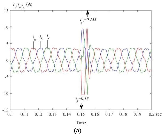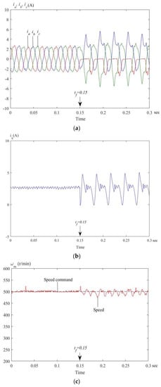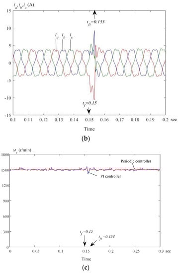 Figure 25a,b show the simulated multiple faults when the a-phase leg was open-circuited and the a-phase current sensor was faulty using the periodic speed-loop controller. Figure 25a shows the simulated currents, and Figure 25b shows the simulated speed.