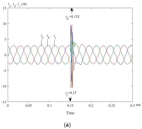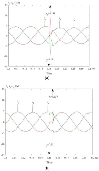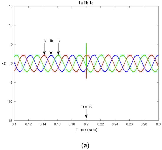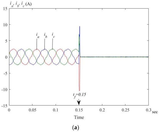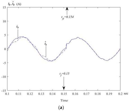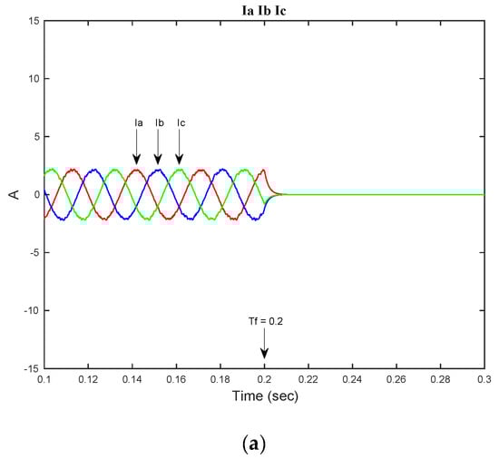 This paper also investigates the detection and control of a fault in a one-phase current sensor. Previous research used a current estimator to evaluate the current sensor error, and an adaptive threshold was used to detect and diagnose the faulty condition [,]. In a faulty condition, the estimated current replaces the faulty current. The – axis voltages and currents were obtained using a coordinate transformation, and the estimated – currents in the discrete time domain can be expressed as