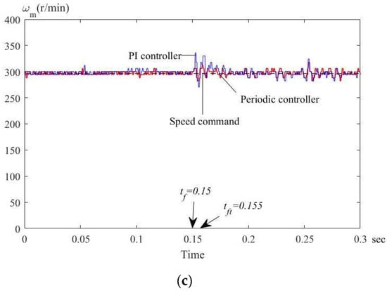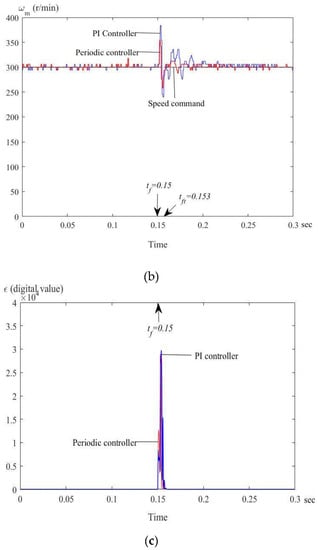 where is the fundamental period and is the sampling interval of the speed-loop control system. The fundamental period determines the delay of the periodic controller in N steps. The delay steps determine the settling time of the SPMSM drive system. If the delay time is set too short, the output generates obvious overshoot but has quick responses; however, if the delay time is too long, the periodic controller has slow responses. The choice of the parameter N depends on the designer’s experience. In addition, the periodic controller is added into the speed-loop PI controller in the forward loop [], which is shown in Figure 3c. The speed-loop PI controller is used to improve the transient responses and load disturbance responses for the normal operation speed dynamics; however, the speed-loop periodical controller is used when the SPMSM drive system is faulty, which causes three-phase current imbalance. In Figure 3c, is the transfer function of the SPMSM drive system, is the speed-loop PI controller, and is the periodic signal generator, which is used to reduce the current harmonics. After that, the speed command is input into the closed-loop system. In this closed-loop system, a periodic signal output is added to the speed error to generate the total input of the PI controller to control the system.