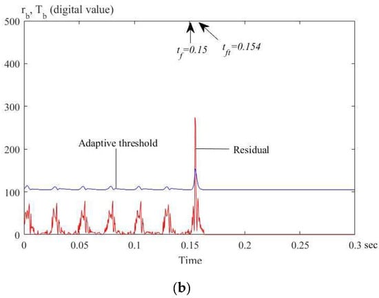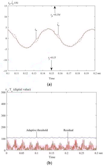 Measured results of the b-phase when the b-phase current sensor was faulty: (a) measured and estimated current; (b) residual and adaptive threshold.