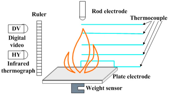 It is necessary to obtain the statistical law of the shape and size of vegetation combustion particles for simulation. The heat release rate and temperature distribution of vegetation combustion also need to be measured. The experimental arrangement of typical vegetation combustion and measurement is shown in Figure 1. The vegetation is placed on a plate electrode. A weight sensor is placed below the plate electrode to measure the rate of vegetation mass loss during combustion. Then the heat release rate can be calculated by combining the burning calorific value of different vegetation. The varied process of flame shape and height change is photographed and recorded, combined with a digital camera and ruler. An infrared thermal imager can be used to photograph the temperature distribution of the whole flame. At the same time, the thermocouple array can record the temperature values at different heights in the flame. Rod electrodes are suspended directly above the vegetation and applied with DC voltage.
