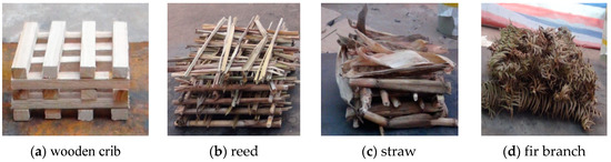 The arrangement of the wooden crib is simple and repeatable. Most of the previous studies for breakdown characteristics of clearance under flame conditions use this wooden crib. However, due to the difference of component content, the combustion effect of branches and leaves is quite different from that of the wooden crib. It shows that the breakdown voltage of clearance under the branch and leaf combustion is significantly lower than that of a wooden stack. Therefore, reed, straw and fir branches were selected as three typical plants to cause the trip of transmission lines due to a vegetation fire. At the same time, the wooden crib test was carried out as a comparison. As shown in Figure 2, the vegetation or wooden crib is arranged in a square stack of 21 cm × 21 cm × 10 cm. In order to ensure the same burning intensity each time, the typical vegetation was assigned with the same quality in repeated experiments. Typical vegetation is exposed to the sun for several days before the experiment to ensure dryness, as in nature. The effect of different moisture content on combustion is avoided.