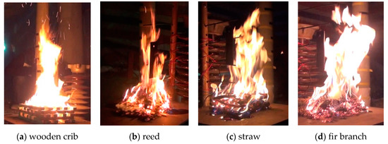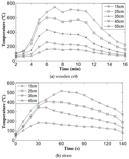Temperature variations at different heights on the axis of each planting flame are obtained by temperature sensors. The burning time of the wooden crib is the longest, being about 14 min. After ignition, the temperature of each thermocouple is recorded every minute. The burning time of reed, straw and fir branches is relatively short, so the thermocouple readings are recorded every 10 s after ignition. For instance, comparison of the flame temperature distribution between the wooden crib and straw is shown in Figure 3. With the increase of flame, the temperature increases gradually. When the maximum fire is reached, the combustion will remain stable for a period of time, and the temperature will reach the maximum. The maximum flame temperature of wood is 747 °C, while that of straw is 518 °C. The maximum temperatures of reed and fir branches are 306 °C and 273 °C, respectively. According to vegetation combustion, the gap can be divided into a continuous area, an oscillating area and a smoky area. The continuous area is about 0~30 cm above the vegetation. The highest temperature is found in the continuous flame area about 15 cm above the wood. The height of the oscillating area is about 30~55 cm. In the oscillating area, the flame will oscillate up and down, and the flame does not always exist. The smoky area is filled with particles and smoke generated by combustion, and the temperature is low.