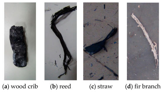 The stable combustion flames of the four combustible materials are shown in Figure 4. The smoke concentration produced during combustion is small. Because the burning material has been exposed to the sun for a week, the water content is low, and the burning is sufficient. The combustion products of vegetation in the experiment mainly consist of carbon black particles of micron magnitude and ashes of large size. A differential motion particle size meter (DMPS) was used to analyze the size of these carbon black particles. The particle size of carbon black is about 0.02–0.05 μm. These carbon black particles will aggregate into spherical or chain-like particles with a size of about 10–300 μm. For instance, the size of aggregated carbon black particles produced by the wooden crib combustion is from 0.01 μm to more than 43 μm. The two peaks of the contents of different sizes are 0.3 μm and 43 μm, respectively. These carbon black particles are charged, and may be adsorbed onto large size ashes. They further distort the space electric field and lead to trigger discharge.