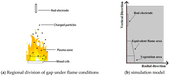 The size of the flame area is set according to the experimental data of different vegetation. The radius of the rod electrode is 1.5 cm, and the length is 15 cm. The boundaries of the whole model are set to open boundaries.
