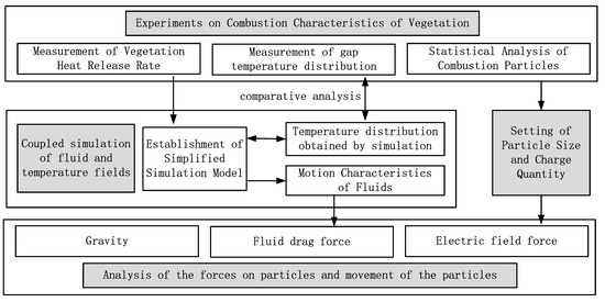 Therefore, combined with the characteristics of vegetation combustion particles, temperature field, fluid field, electric field and fluid motion are comprehensively simulated and analyzed in this paper. Positive and negative DC voltages are applied to the electrode respectively, and then combustion experiments are carried out under the electrode using different typical vegetation. Both the size and morphology of typical combustion particles are statistically analyzed. The temperature distribution of the gap under different vegetation flames was measured. According to the measured thermal generation rate of vegetation flame, the temperature distribution and fluid characteristics are obtained by a coupling calculation of fluid and temperature fields. The drag force acting on the particles is further calculated. Considering the drag force, electric field force and gravity, the forces on particles and movement of the particles in the process of rising are calculated.