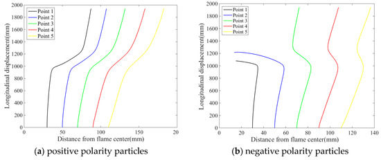 50 kV DC voltage with positive and negative polarities is applied to the electrodes respectively. Particles with different sizes and charges are set up to simulate and analyze. The gravity action is considered. The electrode is set to positive polarity. The combustion particles are set up with different mass, charge polarity and quantity. Firstly, five initial points are selected along the edge of the vegetation, and the overall trajectory of the particles is shown in Figure 9. When the polarity of the particles is the same as that of the electrode, the particles are mainly affected by the drag force of the fluid in the initial drift stage.