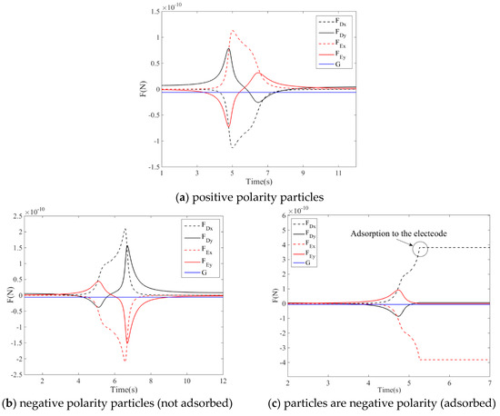 Then the force acting on the particles in the whole process is analyzed. Take a charged particle as an example, the variations of air drag force, electric field force and gravity are shown in Figure 10. Particles begin to rise from the initial position at a certain initial velocity. When the polarity of the particles is the same as that of the electrodes, the particle rises under the action of drag force to overcome the influence of gravity and of the electric field. As the electric field force increases near the electrode, the drag force increases rapidly. When away from the electrode, the drag force and electric field force in the x-axis direction decrease gradually. When particles move from below the electrode to above it, the electric field force in the y-axis direction will be reversed, and the corresponding air drag force direction will also be reversed, and then gradually reduce. When the polarity of particles is opposite to that of electrodes, there are two situations: One is that the particles are adsorbed by the electrodes, the other is not adsorbed. In initial period, particles are subjected to electric field force and drag force to overcome gravity and rise. When the particle rises near the electrode height, the x-axis electric field force increases rapidly, which makes the particle move toward the electrode. The Y-axis electric field force increases slowly and then decreases as it approaches the electrode. If the particles are adsorbed by the electrodes, the y-axis electric field force is approximately 0, and the x-axis electric field force reaches the maximum. If the particles are not adsorbed by the electrodes, the particles are first close to the electrodes and then far away. The Y-axis electric field force and air drag force will be reversed, and because it is closer to the electrode, the reverse peak will be larger, and then gradually decrease.