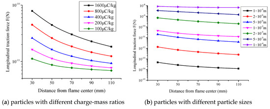 As shown in Figure 11a, when the particle size is the same, the larger the charge-mass ratio, the greater the longitudinal drag force on the particle. When the particle is near the center of the flame, the drag force on the particle will increase gradually. As shown in Figure 11b, when the charge of particles is constant, the larger the particle size, the larger the longitudinal drag force. With the increase in size, the drag force of fluid mainly balances gravity, and the electric field force is relatively small. When the particle size is large, the distance between the particle and the center has little effect on the drag force.