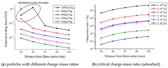 As shown in Figure 12a, the particles are easily adsorbed by electrodes when the charge of particles is large. Although the drag force decreases with the distance from the electrode, the electric field force decreases more. The farther away from the electrode, the harder the charge is to be absorbed. As shown in Figure 12b, the farther away from the electrode, the larger the critical charge-mass ratio required for particles to be adsorbed by the electrode, and the critical charge-mass ratio decreases with the increase of particle size. Under the same charge-mass ratio, larger particles are easier to be adsorbed by the electrode.
