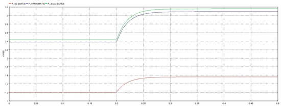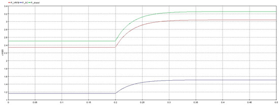 Figure 18 shows the power adjustment curves when the self-learning fuzzy sliding mode droop control is applied. The red curve represents the super-capacitor (SC) unit power control curve with a rated power of 1.5 kW. The blue curve is the vanadium redox flow battery (VRFB) unit power control curve with a rated power of 3 kW. The green curve represents the power control of the diesel power generation unit with a rated power of 3 kW. When the load changes at 0.2 s, the power adjustment time is only 0.1 s, and the system reaches stability at 0.3 s. It is shown that the power overshoot of the inverter output is small. In addition, the active power output value can track the reference command value better. Hence, there is a lower oscillation degree. Moreover, the setting time is shorter. Therefore, the output power of the system is optimized under the proposed method, by which the stability of the system and power distribution accuracy is improved.
