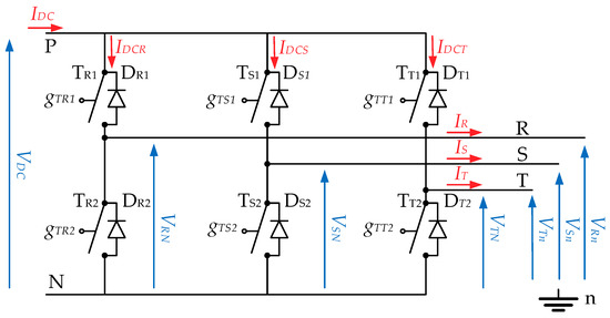 Figure 2. Two level three-phase inverter comprising the DC link (with VDC, IDC voltage, and current highlighted), six bidirectional switches (six active switches and six antiparallel diodes), and the output phase terminals (with phase current and voltages IRST, VRST-N, VRST-n, highlighted).