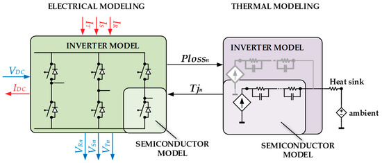 The core of the inverter was the different semiconductors models, which were combined to build the inverter model. This model was divided into two main parts: the electric part and the thermal part. Both parts were joined through the electric model concerning power losses and the junction temperature of the semiconductors, as can be seen in Figure 3.