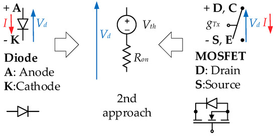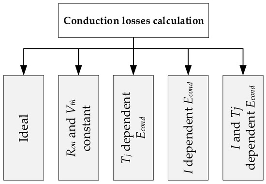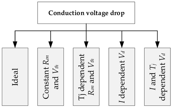 Therefore, according to the five different variants modeled for the conduction behavior, the conduction losses can be modeled by means of their equivalent voltage drop models (Figure 7).