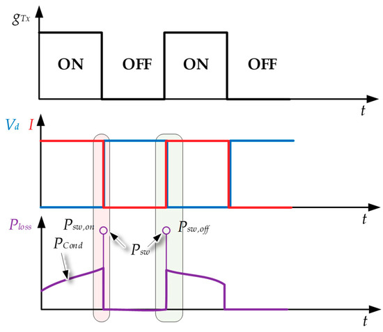 Regarding the conduction losses, when a semiconductor is turned on, it behaves as an ideally gate controlled (gT) switch, which results in a voltage drop Vd through its terminals, as described in Section 2.1. Depending on the required model accuracy, the voltage drop can be modeled taking into account different variables. The antiparallel diode can also be modeled through the same approach. The ideal switching waveforms of a semiconductor and its power losses (conduction and switching) can be seen in Figure 6.