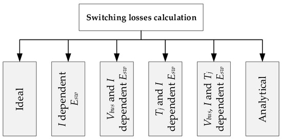 Therefore, while the waveforms are considered ideal in any modeling scenario, the switching power losses are approached by means of six different variants (Figure 8).
