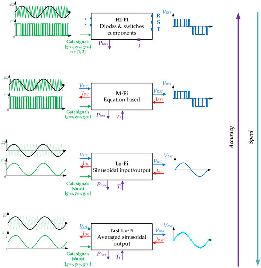 Furthermore, the thermal behavior of the semiconductors and thus the whole inverter were also modeled by three different variants, providing different accuracy/simulation speed performances. The combination of the available electrical and thermal variants provided up to 450 modeling options for each of the four accuracy levels (Hi-Fi, M-Fi, Lo-Fi, and Fast Lo-Fi) considered.