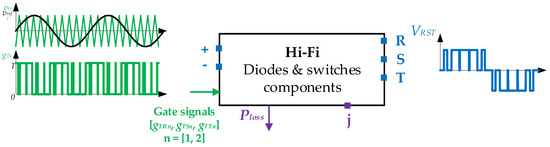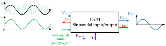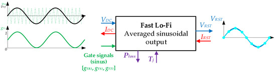 The main difference between the three models can be seen at a glance in Figure 24. While the output waveform of the Hi-Fi model was a pulsed signal, the Lo-Fi and Fast Lo-Fi models’ waveforms were equivalent to the controller’s reference low frequency signals. Furthermore, as seen in the conduction and switching power losses, the higher simulation step size resulted in a higher delay in the waveforms.