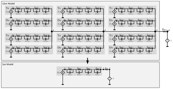 Regarding the thermal models, the most detailed 12 × n individual model can be easily exchanged for the less complex 12 × 1 model, which accurately approaches the different semiconductors’ junction temperatures with less computational cost and faster simulations. The 1 × n model averages the different semiconductors’ thermal behavior and estimates a single junction temperature for the whole inverter. Although this model is not useful in determining the temperature ripple in the semiconductors and identifying the thermal stress distribution among semiconductors, it can be a valuable tool for long term simulations, since it can reduce the simulation time to half in comparison to the most detailed 12 × n model.