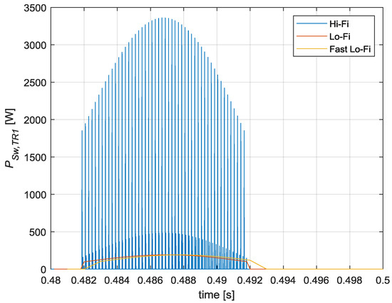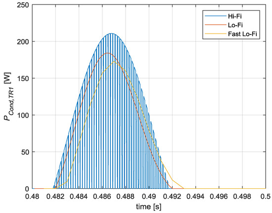 In Figure 22, the conduction losses obtained with Hi-Fi, Lo-Fi, and Fast Lo-Fi models are shown. The compared waveforms show that the three models provide different results. The delay effect of the larger sample time of the Fast Lo-Fi model can be easily seen in Figure 22. The same delay effect can also be seen with the Lo-Fi model, where the smaller step size provides a closer estimation regarding the reference Hi-Fi model waveform.