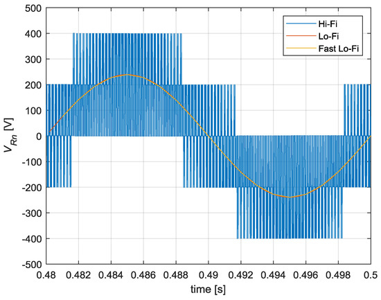 The conduction losses, the switching losses, and the output voltage of the inverter were compared in the first term. The Hi-Fi and M-Fi models offered a very close performance, as demonstrated by the results in Table 3. The waveforms obtained with Hi-Fi and M-Fi models were also very similar; hence, for the detailed comparison between the rest of the modeling approaches, only the Hi-Fi model waveforms are considered. All of the comparison tests were carried out for the working point described in Table 2.