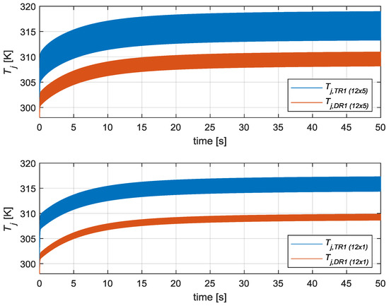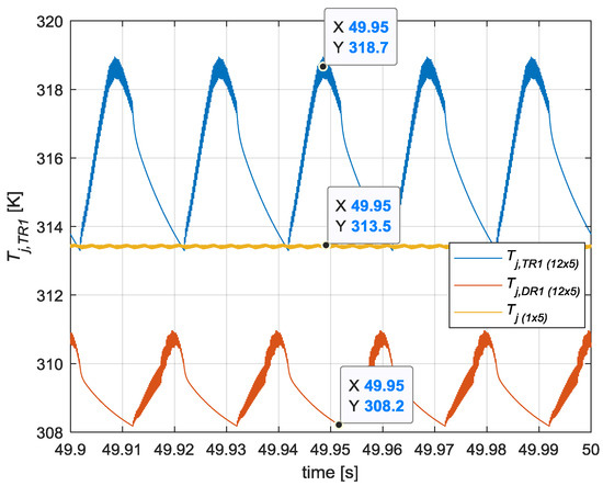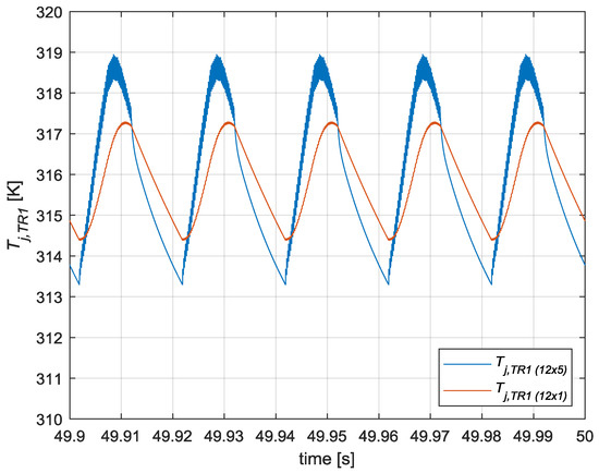 The upper plot in Figure 25 shows the transient state of the junction temperature of the TR1 active switch and the DR1 diode with the most accurate 12 × 5 RC thermal model (n = 5 RC pairs were considered). The waveforms showed that both semiconductors had similar junction temperatures and evolution in time, but they were not equal, since they dissipated different power losses and their associated thermal circuit parameters were different.