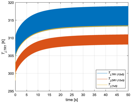 After observing the good accuracy provided by the 12 × 1 RC thermal model, the accuracy of the most simplified global equivalent model 1 × n RC model was also analyzed. The results can be seen in Figure 27 for a n = 5 configuration.