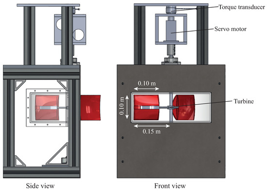 The rotation of the turbine was precisely controlled by a servo motor (AKM11B-ANCNC-00) connected to a turbine shaft with a 4.8:1 gear box, and torque exerted by the servo motor was measured using a torque transducer for 5 min at a sampling rate of 100 Hz for each operating condition. Experiments were performed at different angular velocity under the same incoming flow velocity (), to cover a range of tip speed ratios () wide enough to define the performance curve and the turbine optimal conditions, where is defined as the incoming velocity at the blade center ( and ). For each experimental run, the turbine was forced to operate at a constant angular velocity, while the torque was fluctuating due to the incoming turbulence and the turbine rotation. Earlier experiments in vertical axis wind turbine reported that flow-driven and motor-driven turbines show nearly identical wake characteristics and power performances [29,30]. Each blade had an area of 0.10 m by 0.10 m, the radius of the turbine rotation was 0.15 m, and the center of the turbine blade was located at 0.15 m above the bed surface, thus approximately mid-depth. A slight eccentricity of 0.04m, marking the distance between the sidewall and the axis of rotation, is imposed to make sure the shaft and the power conversion systems would be protected within the bank.