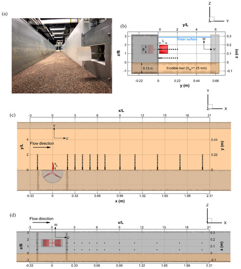 (a) The tested prototype turbine model, (b) view of the channel cross section, and (c) planar and (d) lateral side views of the test section with marked measurement locations; x, y, and z are the streamwise, transverse, and vertical coordinates, respectively, corresponding to the velocity components U, V, and W.